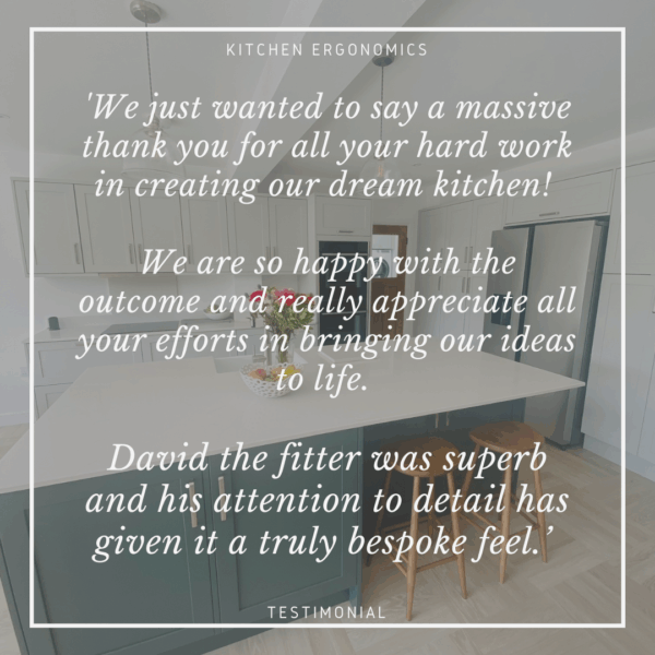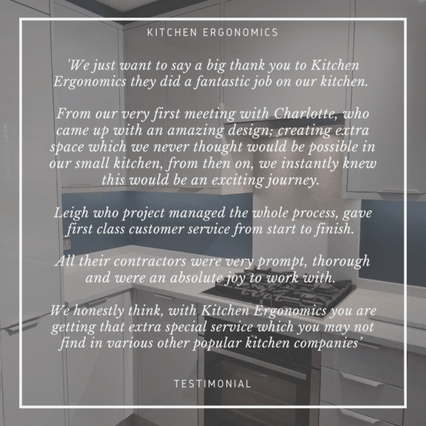 Dear Mr Ward, our kitchen is completed and I would like to pass on my thanks to you and your team for helping us achieve, for me, a truly outstanding kitchen, which I am thrilled and delighted with. A special mention must go to Chris Blyth, who has managed the process from start to finish for us, demonstrating a comprehensive and in depth knowledge of the products as well as understanding our needs and requirements. Chris design showed flair and originality which was functional and practical, on a budget too. Chris also spent time talking through the finer details of the design with us – which I think makes the difference between a good kitchen and an outstanding one. Again a very big thank you to all of the Kitchen Ergonomics team, I will recommend your team wholeheartedly whenever the opportunity arises.